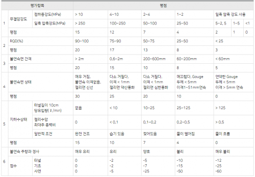 3. RMR(Rock Mass Rating) : 현장이나 시추자료에서 확인 가능한 6가지 변수(암석강도, RQD, 불연속면 간격, 불연속면 상태, 지하수 상태, 불연속면 상대적 방향)에 대한 점수를 통해 암반을 분류하고 평가하는 방법이다.