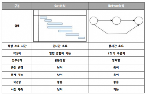 - - Network식 공정표 : PERT(Program Evaluation and Review Technique), CPM(Critical Path Method)