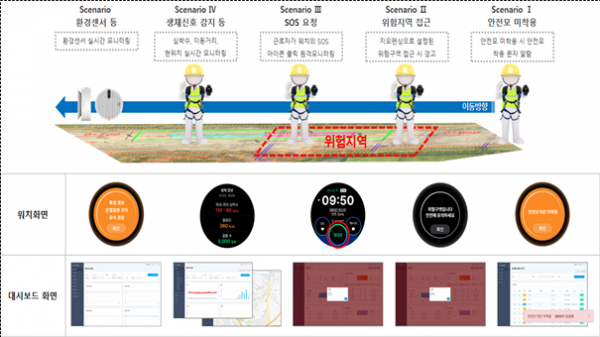 - 환경센서(휴대형/설치형)를 활용하여 주변환경(온습도, 미세먼지, 산소, 일산화탄소, 이산화탄소센서, 황화수소, 가연성 가스 감지) 정보를 실시간 수집하여 위험상황을 판단후 관제시스템 및 스마트워치 알람