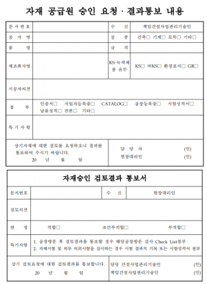 - 시공자 : 건설사업관리기술자와의 협의하에 자재 공급원의 승인 요청을 진행하고, 승인을 득한 후 해당 공급원 활용