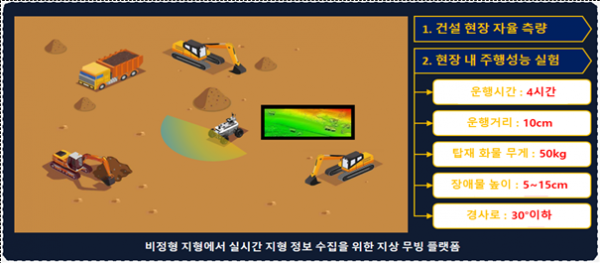 - 건설 현장 주행 시 UGV 배터리 소모율 측정(배터리 완충 상태 → 현장 내 UGV 주행 가능 시간/거리 측정)