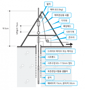 1. 표준관입시험 : 외경 5.1cm, 길이 81cm의 Split Spoon Sampler를 보링로드에 붙여서 원지반에 관입시킨 후 63.5kg의 해머로 낙하고 76cm에서 자유낙하 타격하여 샘플러가 흐트러지지 않은 자연지반에 30cm 관입하는데 필요한 타격횟수를 구하는 시험이다.